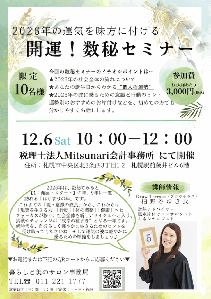 2026年 数秘の運勢 をお話しするセミナーを「暮らしと美のサロン」で開催いたします。