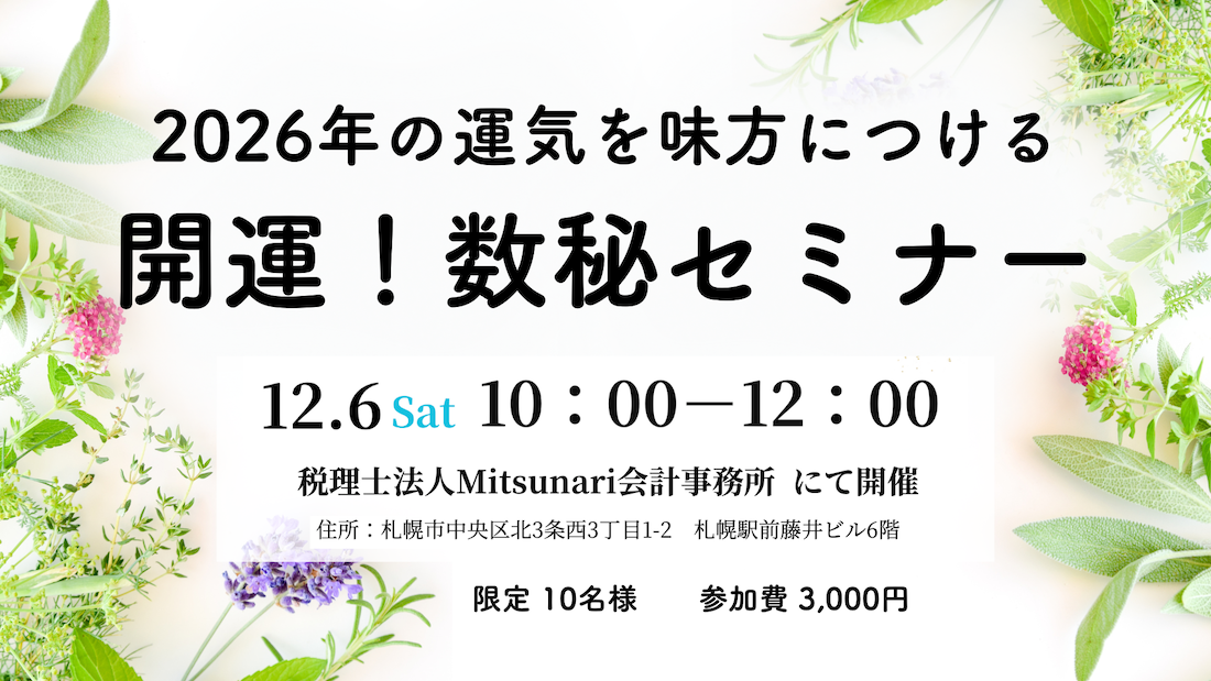 | 会場 | 札幌市中央区北3条西3丁目1-2 札幌駅前藤井ビル6階 税理士法人Mitsunari会計事務所 内 |